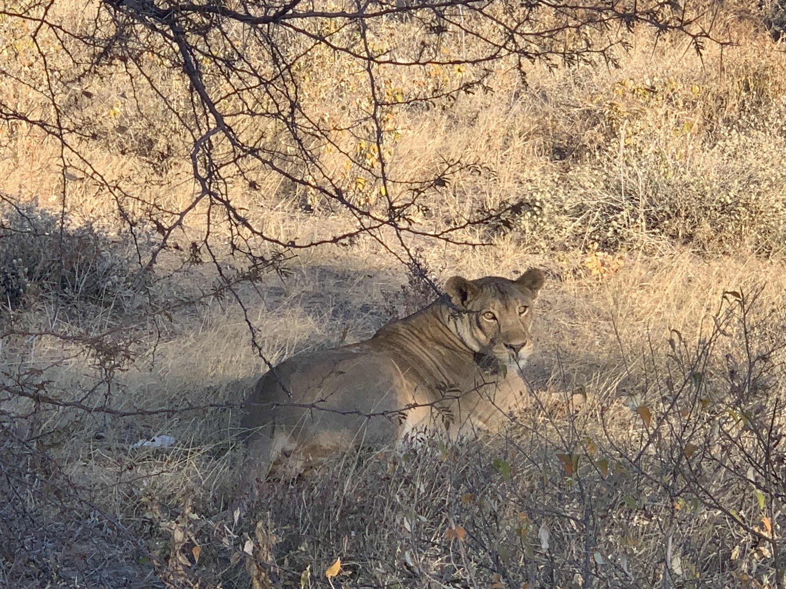 Le plus beau est à venir avec une première lionne sur le bord de la chaussée puis une deuxième puis une troisième. Ce sont 3 soeurs qui ont repéré un troupeau de zèbres et se préparent à l’attaque. Nous assistons à leur stratégie d’approche mais nous ne verrons pas la suite car elles sont loin dans le bush.