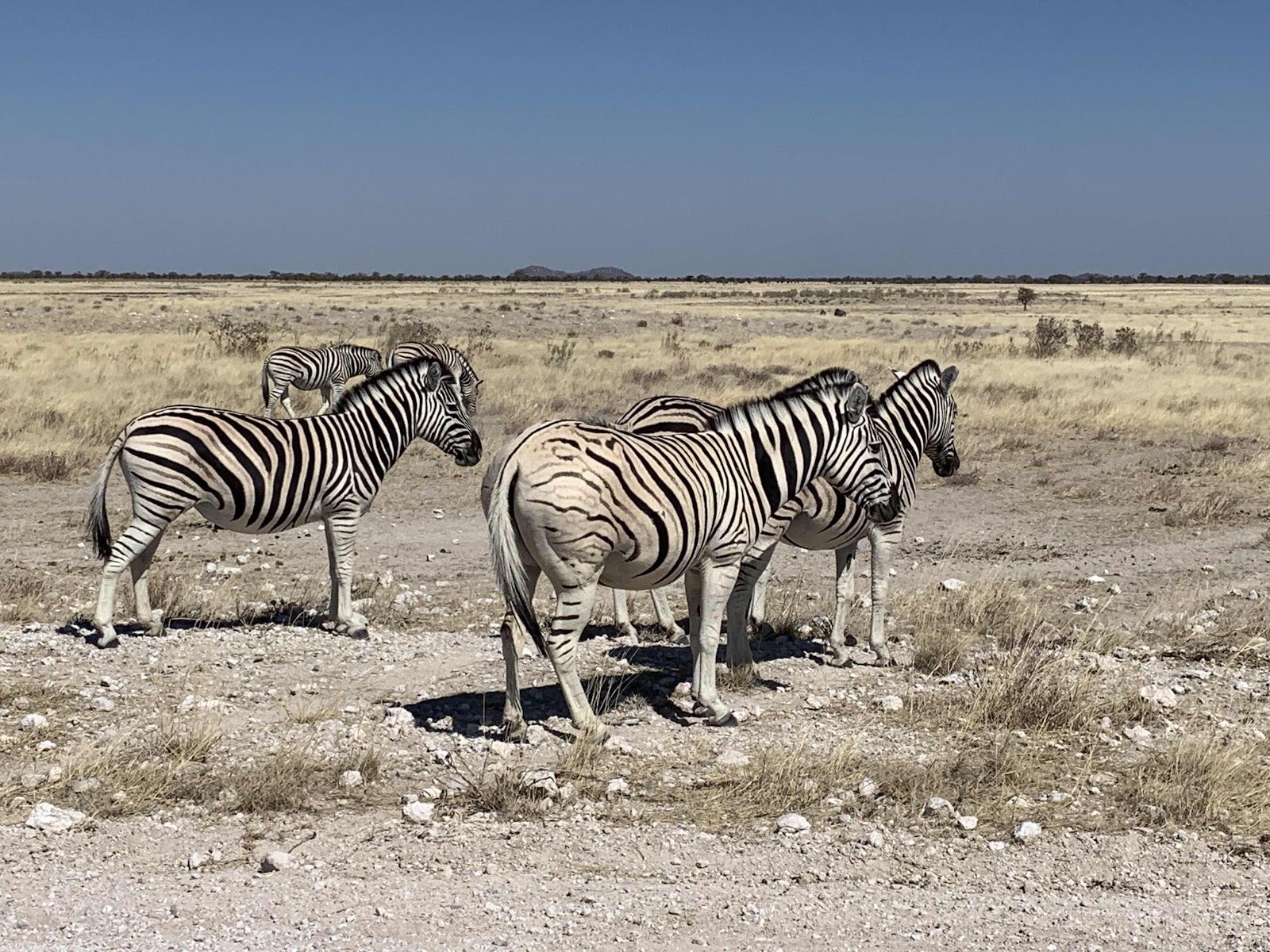 Nous démarrons notre deuxième journée dans le parc d’Etosha. Lors de l’in de nos premiers arrêt à un point d’eau, nous apercevons à nouveau 3 lionnes bloquant un point d’eau, c’est une manie. Nous ne restons pas car nous avons compris que cela peut durer très longtemps. A côté du point d’eau, zèbres, springboks, autruches et girafes patientent